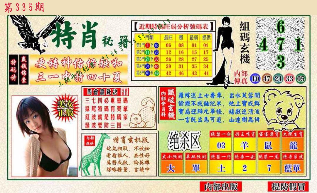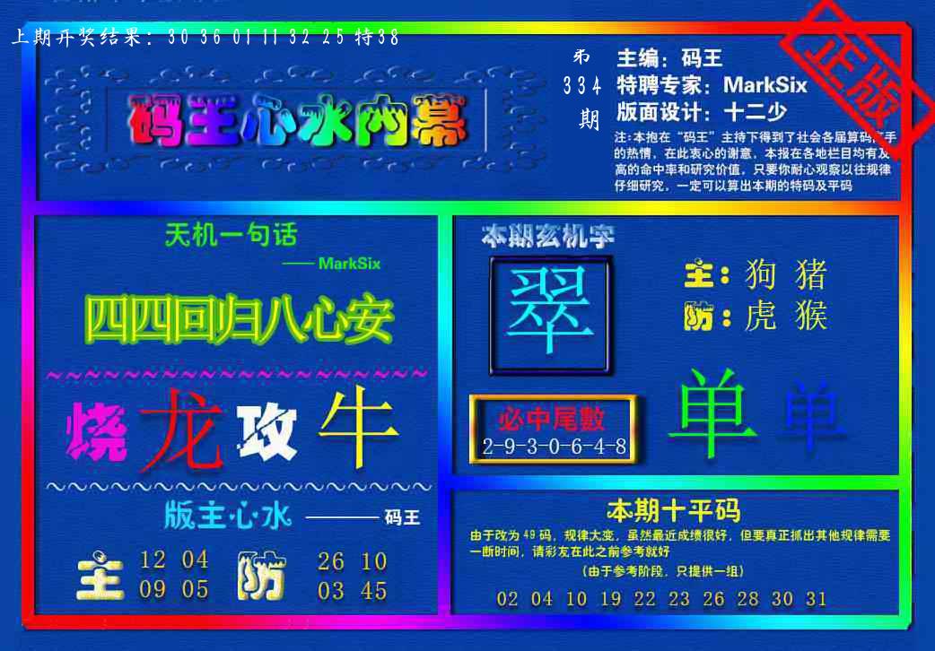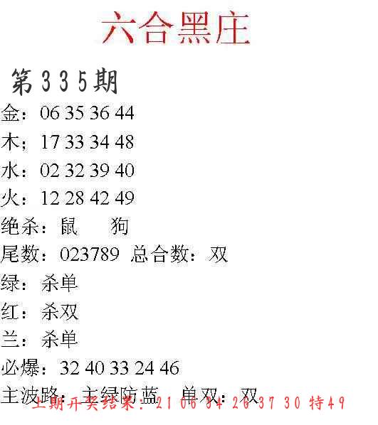 准确率高达90%,期期挑出12-18码 ____________★____________ 【九肖】 334期【羊鼠猴鸡虎马龙牛蛇】开????? 333期【猪龙猴羊牛鸡鼠虎狗】开38龙对 332期【龙鸡蛇猪牛虎羊狗马】开15兔错 331期【狗猪羊蛇龙牛猴虎鸡】开09鸡对 330期【羊兔马猪狗鸡鼠龙牛】开28虎错 329期【狗鸡鼠蛇龙兔猪马虎】开42鼠对 328期【虎兔龙蛇马猴鸡羊牛】开10猴对 327期【狗龙羊鸡虎蛇鼠马牛】开46猴错 ____________★____________ 【四头】 334期【2-1-3-0】开?????? 333期【0-4-3-1】开38龙对 332期【2-4-3-0】开15兔错 331期【2-4-1-0】开09鸡对 330期【0-3-1-4】开28虎错 329期【3-4-0-1】开42鼠对 328期【3-1-2-0】开10猴对 327期【4-1-3-0】开46猴对 ____________★____________ 【四行】 334期【火-土-金-木】开?????? 333期【火-木-金-水】开38龙对 332期【土-水-木-火】开15兔对 331期【土-木-金-火】开09鸡对 330期【金-火-土-木】开28虎对 329期【水-金-土-木】开42鼠对 328期【木-土-水-金】开10猴错 327期【木-土-金-水】开46猴对 ____________★____________ 【七尾】 334期【7-2-1-0-9-8-3】开????? 333期【9-4-6-0-7-2-5】开38龙错 332期【3-2-4-8-7-0-1】开15兔错 331期【2-3-1-5-6-8-4】开09鸡错 330期【0-4-5-2-3-1-9】开28虎错 329期【2-0-9-4-1-7-5】开42鼠对 328期【1-6-5-3-9-8-4】开10猴错 327期【4-5-0-3-6-7-8】开46猴对 ____________★____________ 【双波】 334期【红波+蓝波】开????? 333期【红波+绿波】开38龙对 332期【蓝波+红波】开15兔对 331期【蓝波+绿波】开09鸡对 330期【蓝波+绿波】开28虎对 329期【蓝波+红波】开42鼠对 328期【绿波+蓝波】开10猴对 327期【红波+蓝波】开46猴对 ____________★____________ |